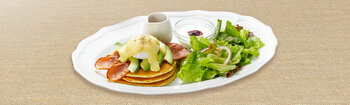※パンはトーストに変更できます。(プラス230円(税込253円)でパンケーキ2枚に、プラス430円(税込473円)でフレンチトーストに替えられます。)
