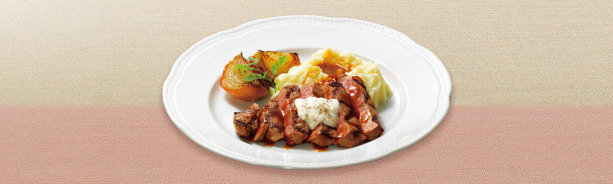 米国産アンガスサーロインステーキ(100g)を北海道の恵みとともにお召し上がりいただけます。ソ ースは、自社のセントラルキッチンで作り上げたグレイビーソースと、爽やかな辛さの北海道産山わさびを使用した店舗仕込みのクリームソースです。付け合わせは、皮付きのまま焼き上げることで甘みを引き出した北海道産玉ねぎのグリルと、北海道産きたあかりのマッシュポテトです。