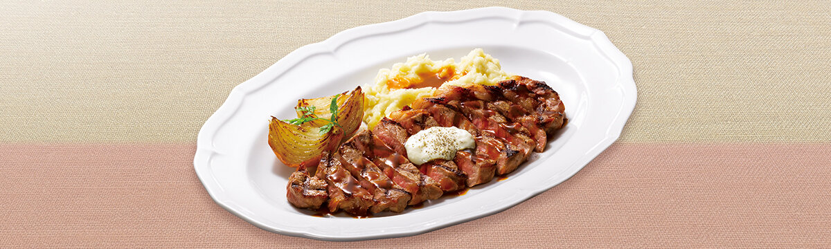 米国産アンガスサーロインステーキ(225g)を北海道の恵みとともにお召し上がりいただけます。ソ ースは、自社のセントラルキッチンで作り上げたグレイビーソースと、爽やかな辛さの北海道産山わさびを使用した店舗仕込みのクリームソースです。付け合わせは、皮付きのまま焼き上げることで甘みを引き出した北海道産玉ねぎのグリルと、北海道産きたあかりのマッシュポテトです。