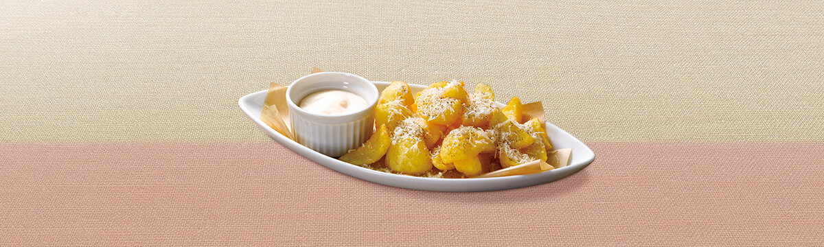 ほくほくとした食感と自然な甘みが特徴の北海道きたあかりをシンプルに素揚げしてフライドポテトにし、塩、ブラックペッパー、パルミジャーノ・レッジャーノをかけました。お好みでアイオリクリームソース(ガーリックマヨネーズ)をつけてお楽しみください。