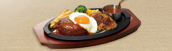 黒毛和牛・国産黒豚を使った、素材の良さを引き出す配合・調味にこだわったロイヤルホスト自慢のハンバーグ。 ブラウンバターソースでどうぞ。