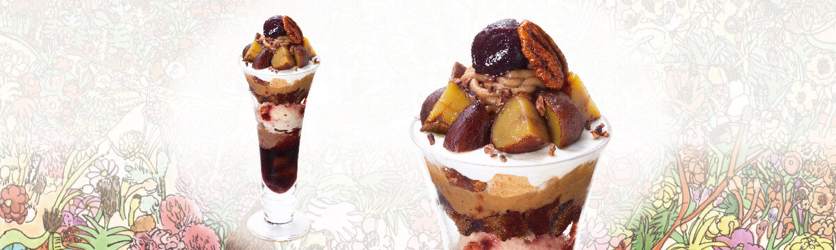 ココアスポンジ、ホイップクリーム、チェリー、チョコレートアイスクリームに渋⽪栗、マロンクリーム、渋⽪栗のアイス、ピーカンナッツ、グラハムビスケット、仕上げにカカオニブなどを合わせたビターで贅沢な味わいをご堪能ください。