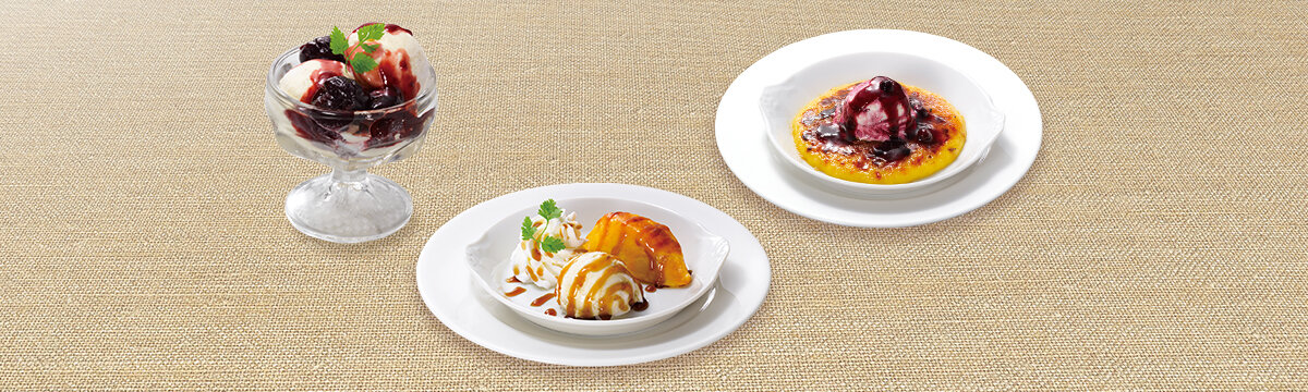 ・プチチェリージュビリー風:バニラアイスクリームと濃厚な温かいチェリーソースをご一緒に。シナモンなどのスパイスが香るチェリーソースと冷たいバニラアイスクリームの組み合わせをお楽しみください。