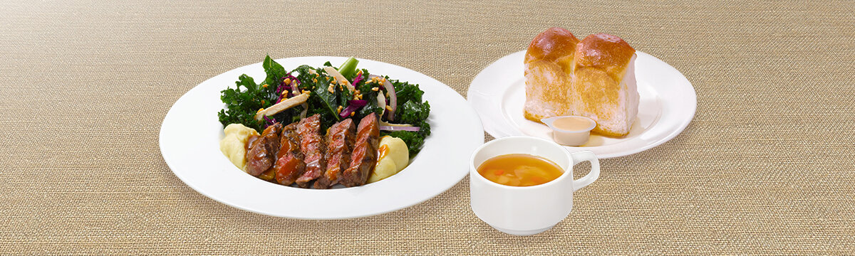 アンガスサーロインステーキ(100g)、ケールサラダ、マッシュポテトを一度に味わえる贅沢なサラダ。